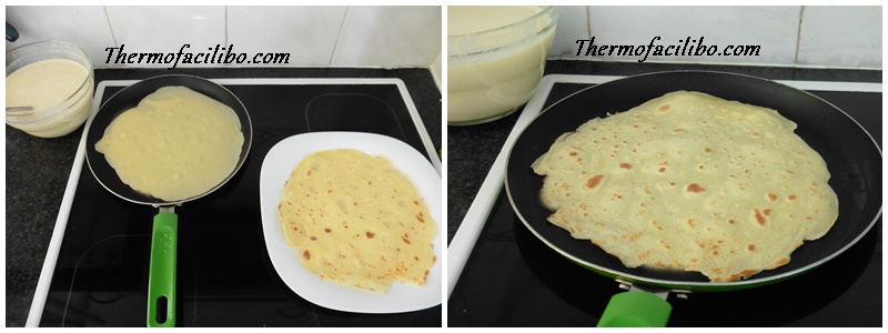 - Untar una paella amb mantega i, quan sigui calenta abocar una porció de massa fent que s’estengui bé per tot el fons girant la paella. Quan sigui daurada, girar i daurar un xic per l’altre cantó, retirar a un plat i continuar el procediment amb tota la massa.