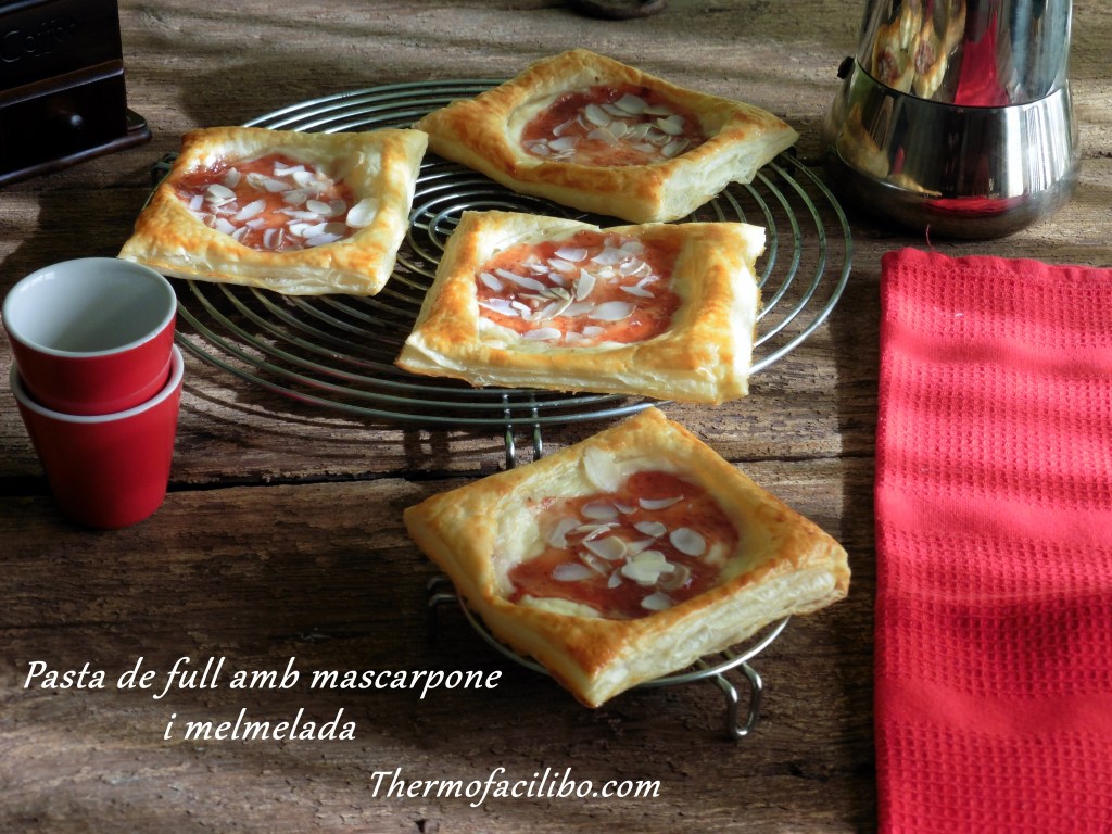 Només cal una làmina de pasta de full, una mica de mascarpone endolcit amb mel. Una cullerada de melmelada, un ou batut per pinzellar i opcionalment, unes quantes ametlles laminades per decorar. Enfornar 15 minuts…. I llestos!!!
