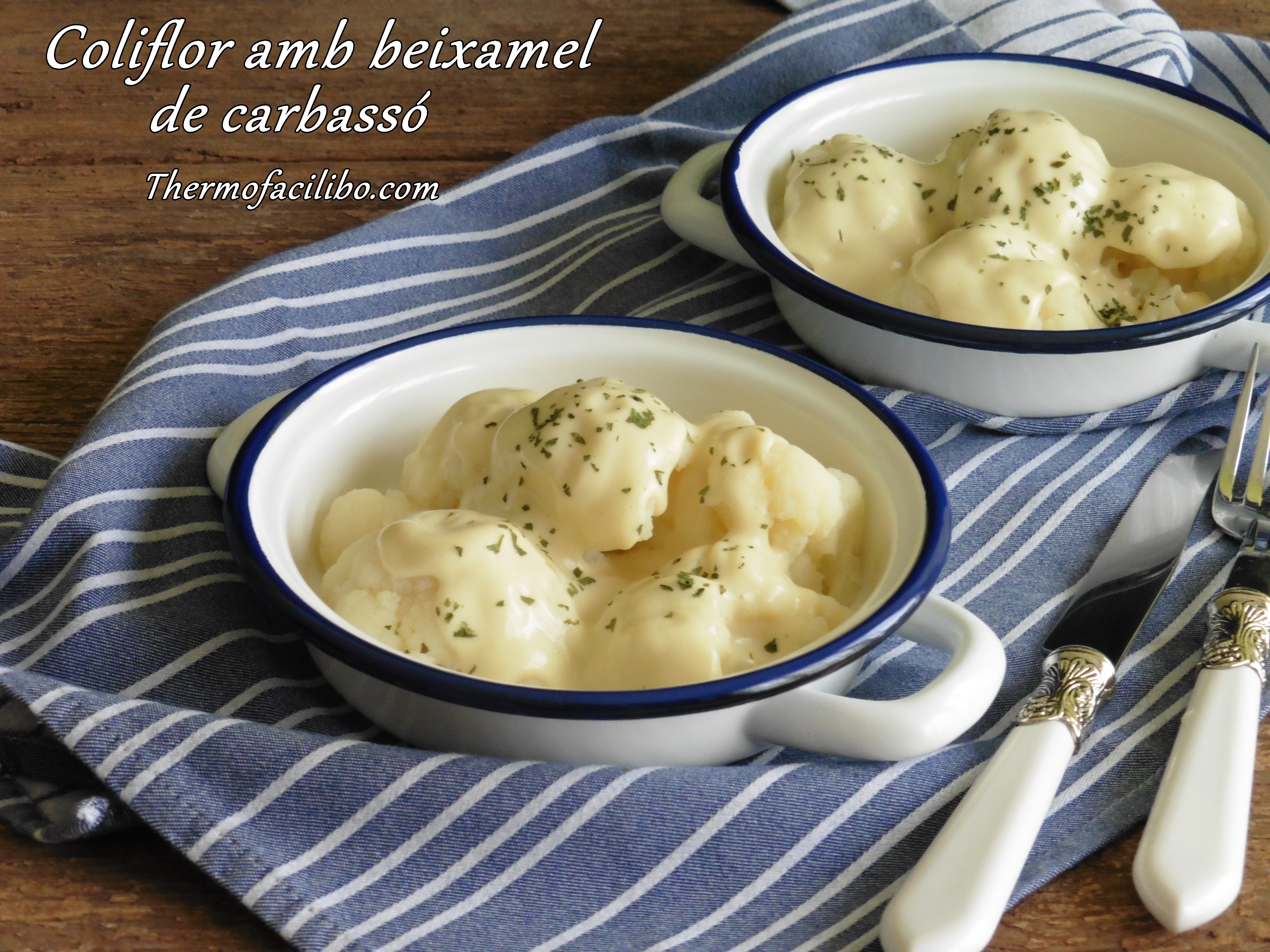 - Servir la coliflor en una safata o bé cassoletes individuals, empolvorar amb sal i repartir la beixamel de carbassó pel damunt. Opcionalment, podem repartir formatge ratllat pel damunt i gratinar uns minuts al forn.