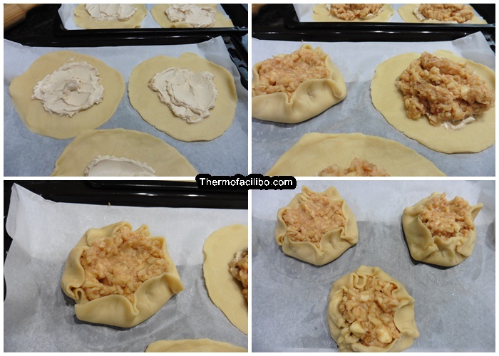 - Al damunt la crema de formatge, posar la mescla de pomes i codony. Aleshores, doblegar la vora de les galettes cap al centre, formant plecs irregulars, de manera que quedi el centre al descobert.