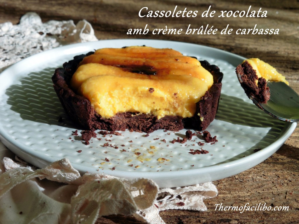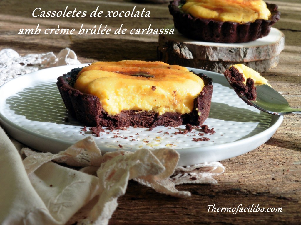 Què us semblen les que acabo de preparar ara mateix?? Són unes cassoletes de xocolata farcides d’una, més que deliciosa, crème brûlée de carbassa. No us ve salivera!!!! Jo, només de pensar amb la combinació de la xocolata amb carbassa i la textura d’una crème brûlée….. Ja em perdo!!!! Jajaja