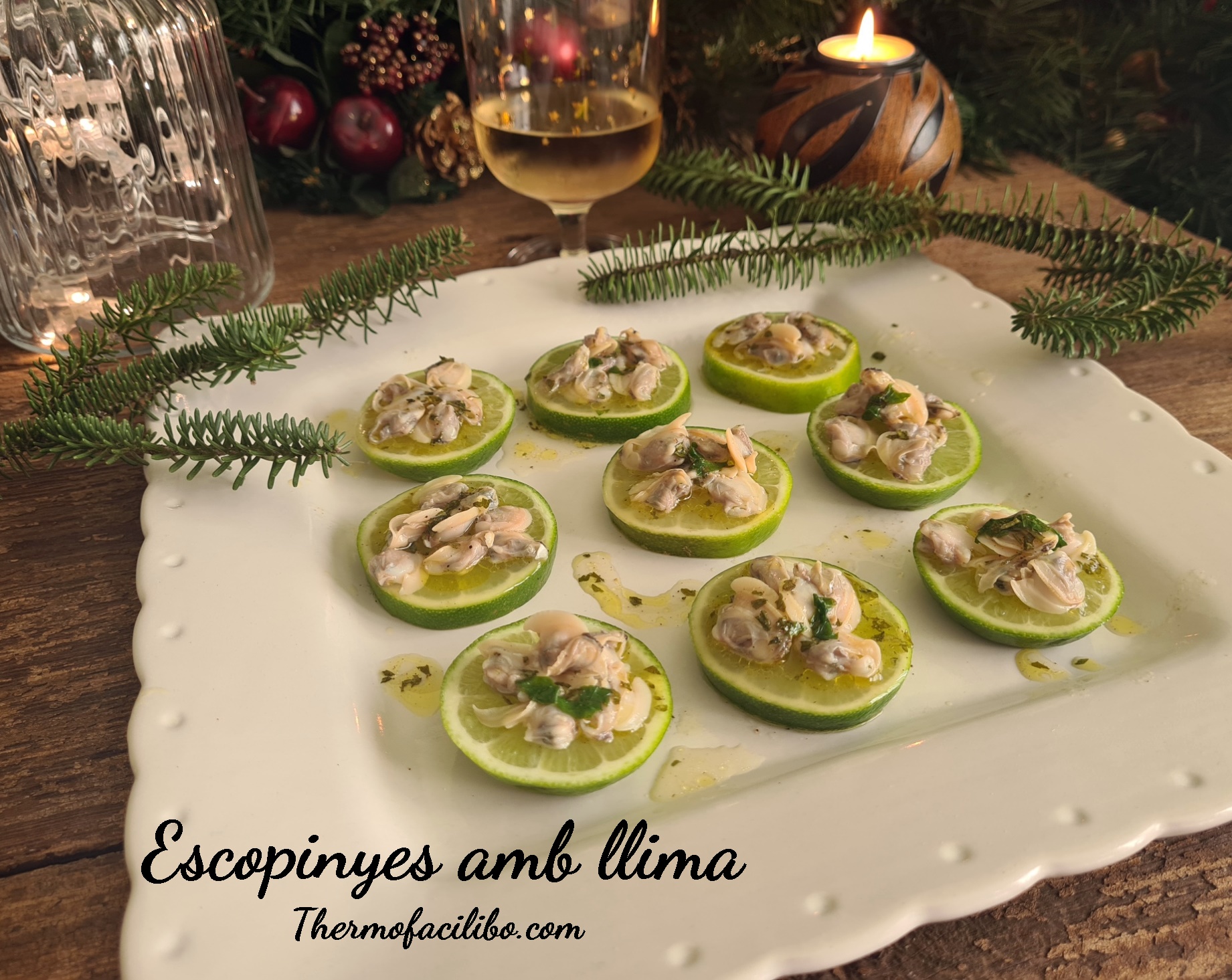 Aquesta setmana ja us he anat posant alguns dels aperitius que he fet, em falta ensenyar-vos uns gambots a la sal (que us ensenyaré ben aviat) i les escopinyes amb vinagreta de llima, que us porto avui. Una «tapeta» molt nadalenca, però alhora també molt lleugera. No tots els aperitius han de ser calòrics!!!! Aquest és light i m’encanta!!!! Són unes escopinyes sense feina, perquè ja hem retirat les cloves, servides al damunt de rodanxes de llima i regades amb una refrescant vinagreta de llima.