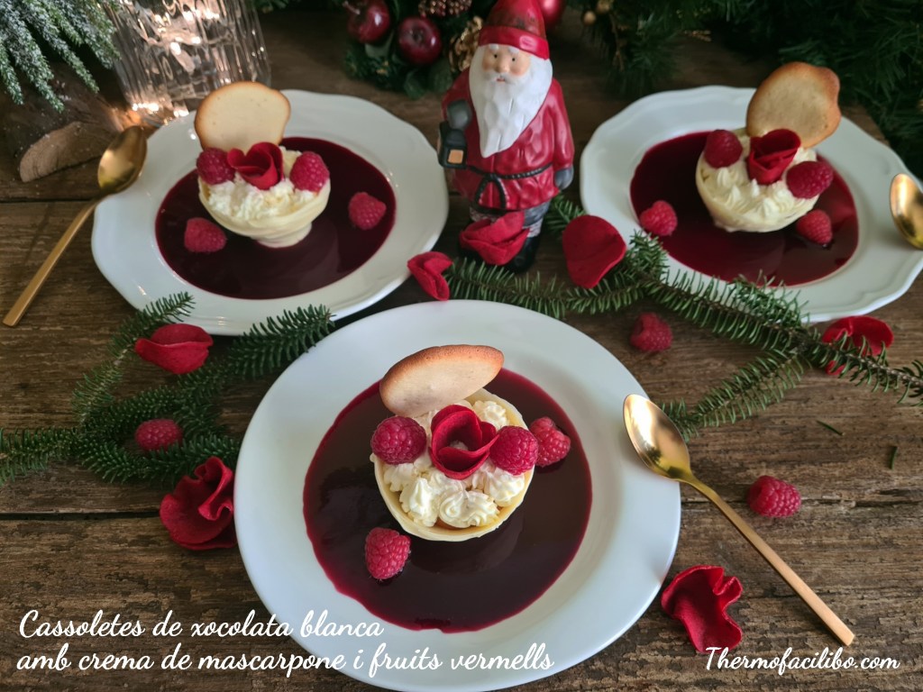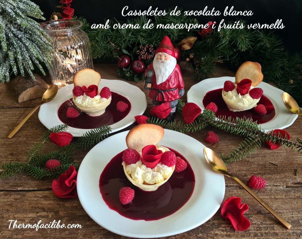 I com que som moolt llaminers i les postres després d’un bon àpat no ens les perdem mai, aquest any m’he decidit a fer aquestes cassoletes de xocolata blanca amb mascarpone i fruits vermells. En surten 8 unitats i com que només hem sigut 4, per Sant Esteve repetirem postres, jejej. Vaja, que ens tornarem a posar les botes!!!!