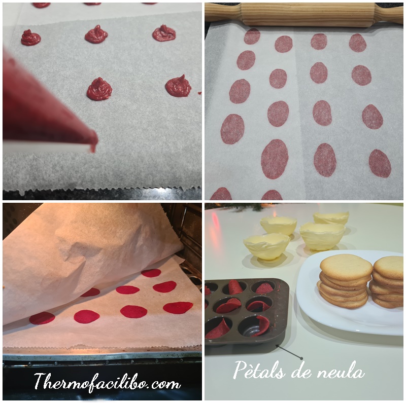 - Afegir la mantega, la farina, la clara d’ou i el colorant vermell barrejar 15 segons a velocitat 5. Abocar la mescla en una mànega pastissera. Sobre una làmina de paper de forn fer petits botons d’1’5 cm de diàmetre separats els uns dels altres 5 cm. Tapar amb una altra làmina de paper de forn i passar el corró per sobre, sense prémer. Col·locar el conjunt en la safata de forn i enfornar durant 4 minuts a 180º. Sense treure del forn i amb compte de no cremar-nos, retirar la làmina superior i, amb una espàtula de metall, anar retirant un a un els cercles. En calent, donar-los forma de pètals i recolzar-los en els forats d’un motlle tipus glaçoneres, de 24 forats. Repetir el procés fins a acabar amb la mescla i deixar refredar completament.