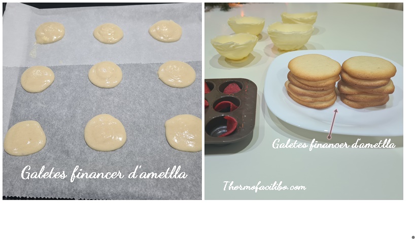 - Afegir la mantega i barrejar 30 segons a velocitat 3. Retirar la papallona.Posar culleradetes de la massa en la safata reservada, separades 5 cm. les unes de les altres. Enfornar 10 minuts a 180º, o fins que siguin daurades. Retirar, reservar i mantenir el forn encès. Rentar i eixugar el got.