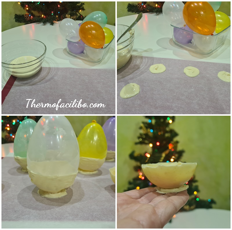 Nota: Aquestes postres tenen nivell de dificultat avançat. Els globus un cop inflats han de tenir un diàmetre de 7-8 cm. aprox. La xocolata ha d'estar temperada en ficar el globus dins, si no explotarà. Recomano fer-ne més unitats del compte perquè sempre acaba explotant algun globus. Per fondre la xocolata, el got i les ganivetes han d'estar completament secs.