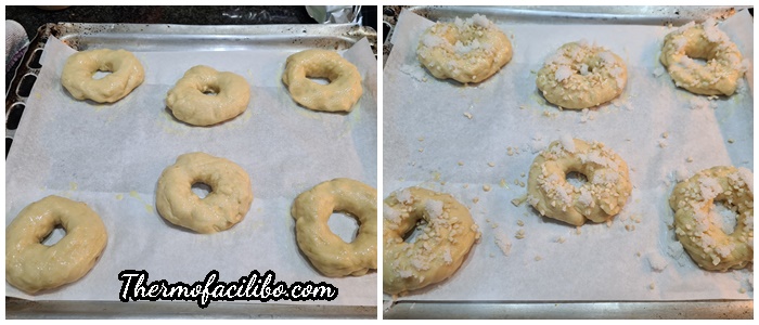 - Per donar forma als tortells, introduir els dits al centre de cada bola i obrir el forat de manera que quedi centrat al mig i d’aprox. 4 cm de diàmetre. Col·locar els mini tortells en les safates reservades, separats entre si, perquè en llevar no s’enganxin els uns amb els altres. Pintar la superfície amb ou batut i repartir el granet d’ametlla i el sucre humitejat pel damunt. Deixar reposar en un lloc lliure de corrents d’aire fins que doblin el seu volum ( 1½ o 2h. aprox)