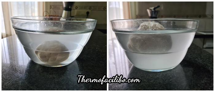 - Posar tots els ingredients dins el got de la thermomix i barrejar 15 segons a velocitat 4. Retirar del got i formar una bola, posar-la en un bol i cobrir-la amb aigua temperada. Quan la bola de massa floti i hagi doblat el seu volum estarà llesta (aprox. 20 minuts, però pot necessitar-ne més)