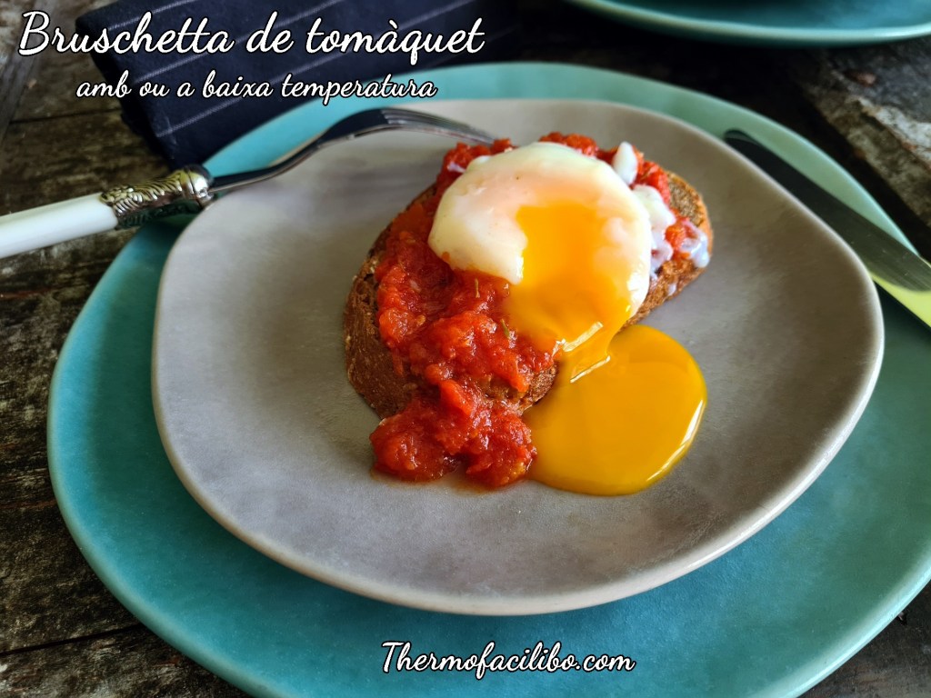 - Posar l’aigua dins el got, introduir el cistell amb els ous i programar 16 minuts, temperatura 70º i velocitat 4. Amb l’osca de l’espàtula, extreure el cistell. Repartir la salsa de tomàquet sobre les llesques de pa. Amb compte de no cremar-nos, pelar els ous i col·locar-los sencers cadascun a sobre una torrada. Empolvorar amb sal i pebre i servir immediatament.
