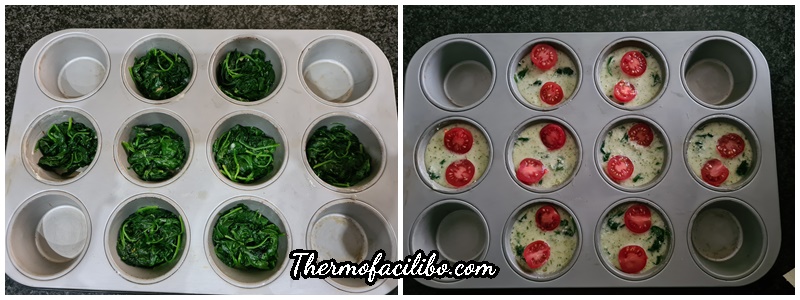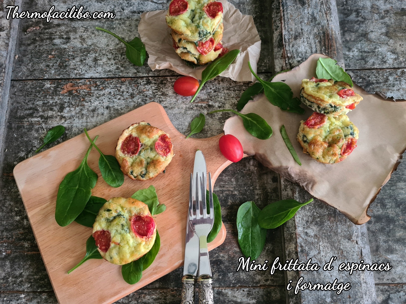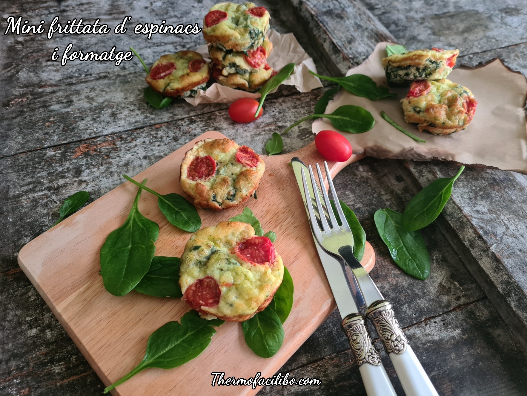 Avui per sopar he fet aquestes mini frittatas d’espinacs i formatge. Són boníssimes!! La frittata és una elaboració de la cuina italiana molt semblant a la truita, ja que és una barreja d’ous i verdures amb formatge, bolets, carn…. La diferència és que aquesta preparació es deixa quallar lentament al forn. Ahh!!! I la podem fer en format gran o individual, com avui, de les dues maneres queda genial.