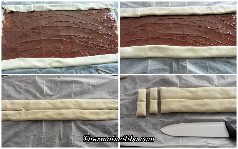- Estendre la pasta de full i untar-la amb la crema de cacau (s’ha de fer una capa fineta perquè en enrotllar no surti pels costats).
