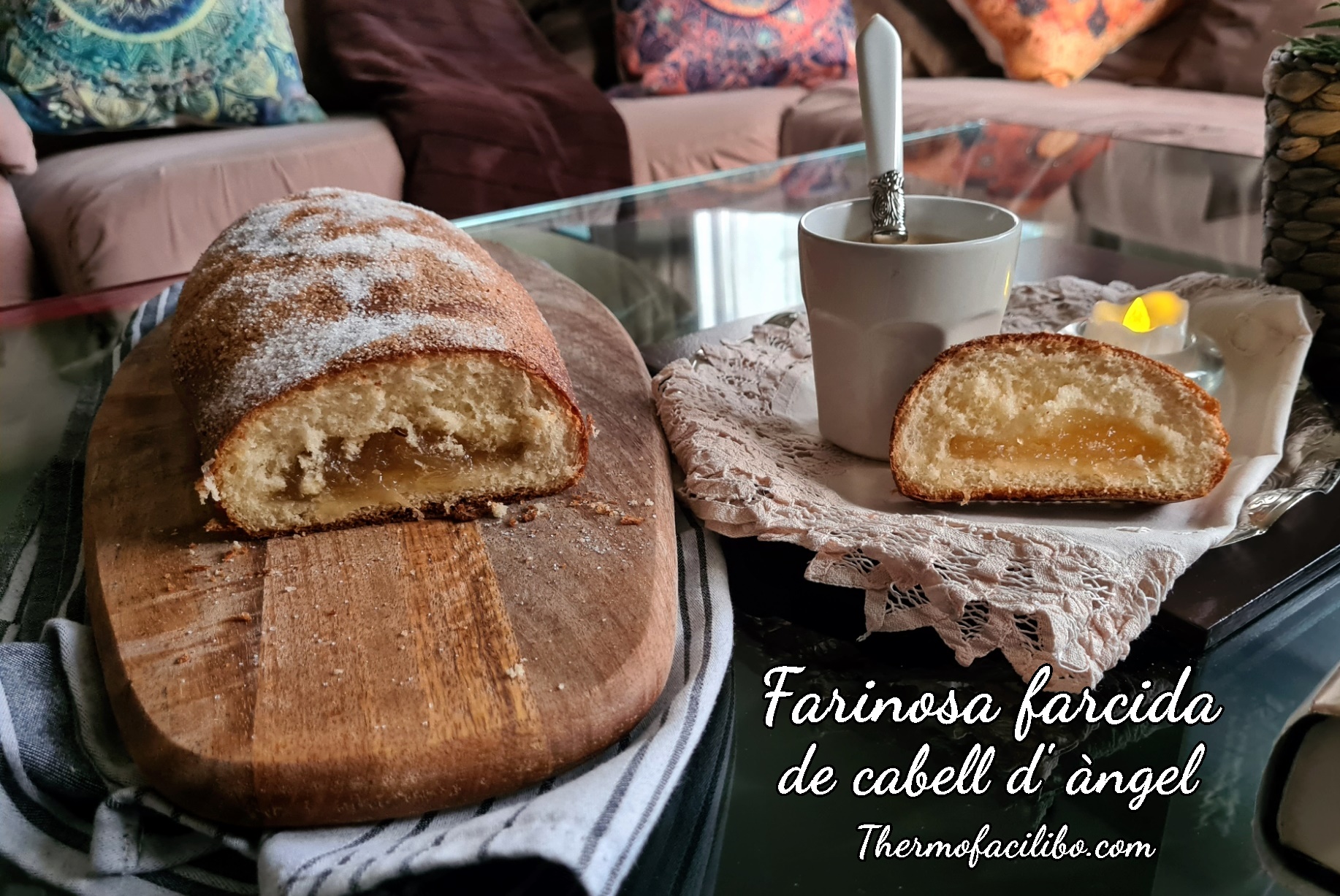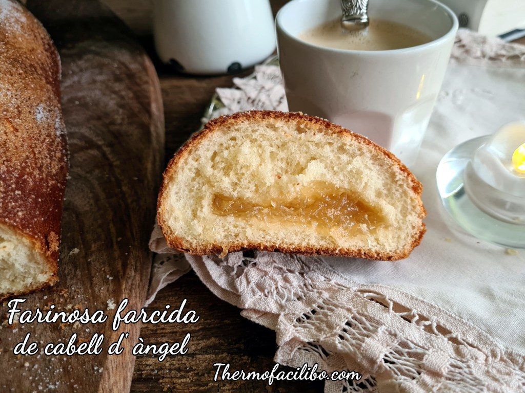 Jo aquesta Pasqua em vaig decidir a fer aquesta original mona, la farinosa amb cabell d’àngel, i tal com mana la tradició, ens la vàrem menjar el dilluns de Pasqua. Però com que en surten dues unitats, i només en vàrem menjar una, l’altra, la vaig congelar, i avui, l’hem gaudit per esmorzar, com una coca de cabell d’àngel. Boníssima!!
