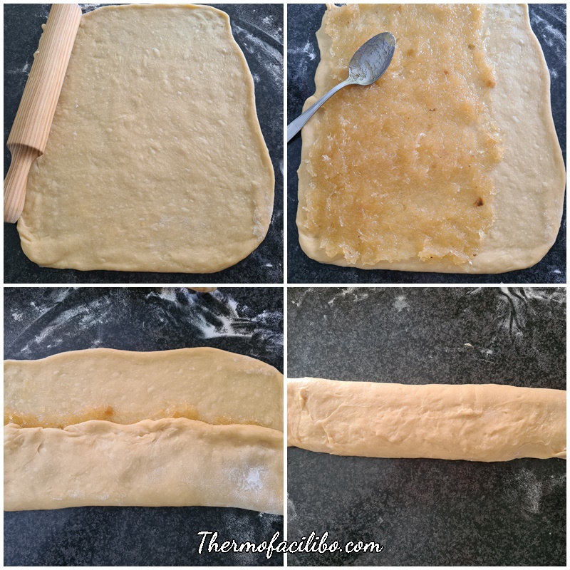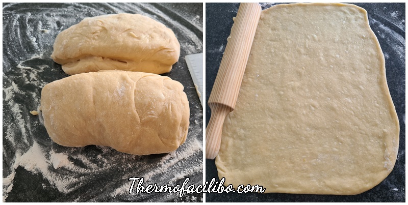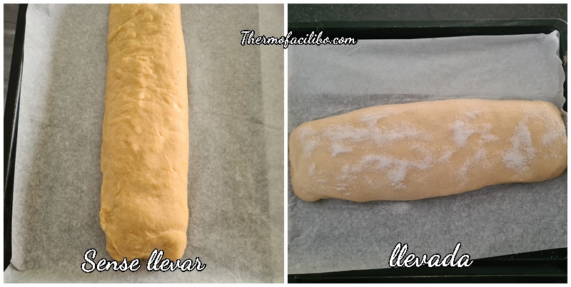 5. Dividir la massa en dues parts, i sobre el taulell de cuina enfarinat, formar amb cada part un bloc. Amb el corró de cuina, formar un rectangle amb cada bloc (d’aprox. 30×40). Estendre 350 g de cabell d’àngel, deixant lliure 1/3 del llarg de cada rectangle. Per formar les barres, plegar cada rectangle com un tríptic, acabant amb la part sense cabell d’àngel i sellar la vora. Col·locar cada barra sobre una safata de forn, prèviament folrada amb paper de forn. Deixar llevar en un lloc lliure de corrents d’aire durant 1½-2 hores fins que dobli el seu volum.