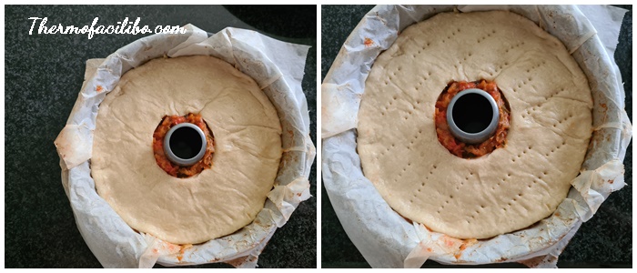 - Amb un corró, estirar la massa entre dues làmines de paper de forn o film transparent i formar un cercle de 22-24 cm de diàmetre. Amb un cercle d’emplatar (de 9 cm de diàmetre), tallar el centre de la massa i retirar-la per formar una corona. Tapar les verdures amb la corona de massa i, amb una forquilla, punxar tota la superfície.