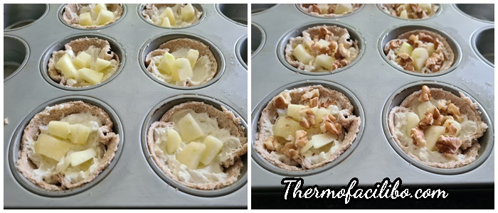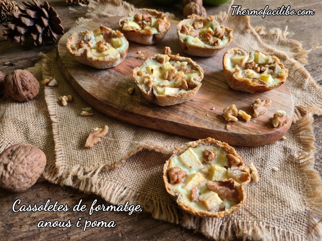 - Posar dins el got el formatge gorgonzola, el mascarpone i la nata. Barrejar 15 segons a velocitat 4. Repartir la mescla dins les cassoletes i afegir-hi al damunt els daus de poma i les anous trossejades.