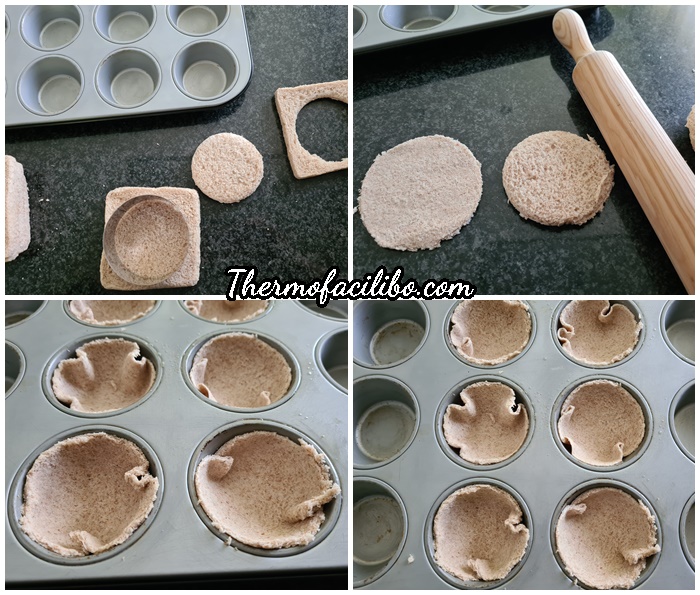 - Amb un cercle d’emplatar o un talla pastes, tallar un disc de cada llesca de pa bimbo. Aplanar amb el corró de cuina i folrar els forats untats amb oli del motlle de muffins.