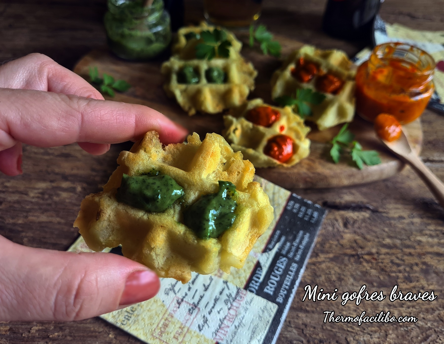 Les acostumo a fer d’aperitiu en dies assenyalats i algunes vegades, en algun sopar informal, d’aquests a base de tapes. Ara feia molt temps que no en preparava, però el meu fill, en Pol, que va estar de vacances a Tenerife aquest setembre, em va portar uns potets de diferents mojos, i em va dir; Què et sembla si aquests «mojos» els acompanyem amb uns gofres braus?? Dit i fet!!!!