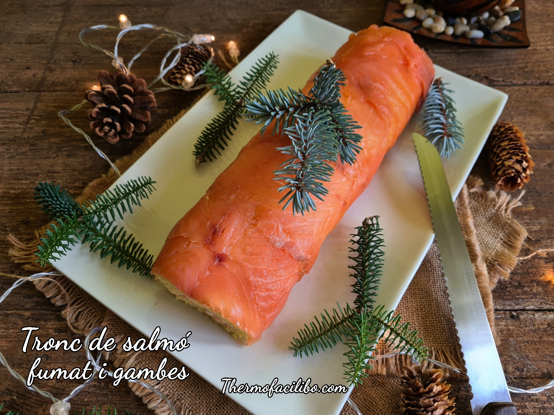 Continuem amb receptes festives….. Què us sembla aquest tronc de salmó fumat i gambes??? A part de vistós és boníssim!!! Genial per a sorprendre a la família o amics en aquestes properes festes. Personalment, m’agraden molt aquests tipus de receptes, ja que les puc deixar preparades amb antelació i això m’ajuda molt a organitzar-me. El què acostumo a fer, és servir alguns entrants de picoteig i després, el tronc o braç farcit. Si és un sopar, a continuació del tronc ja passo a les postres, altrament, si és un dinar, preparo algun plat principal a base de carn per servir-lo a continuació del braç.