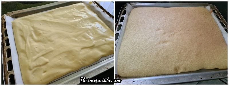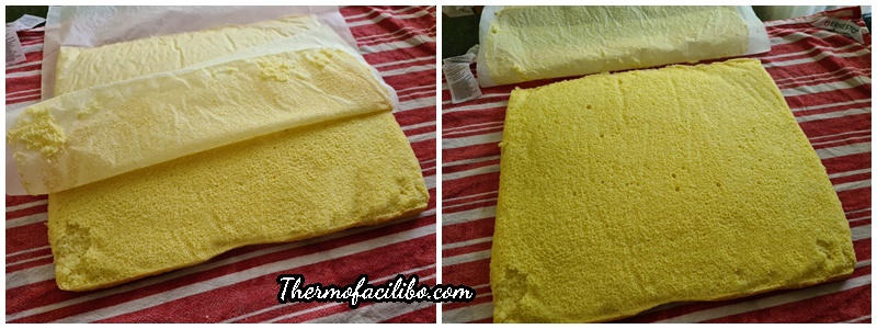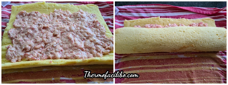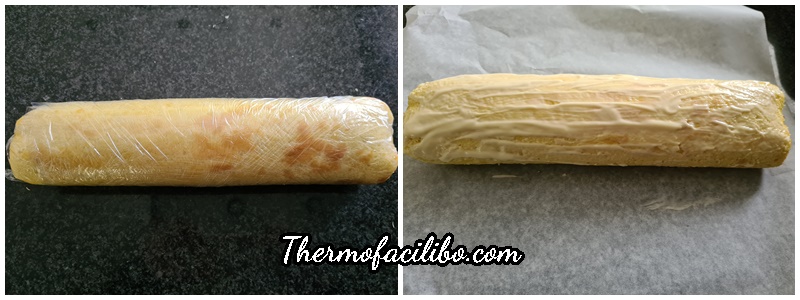 - Desemmotllar el pa de pessic en calent sobre el drap de cuina humit deixant el paper a dalt. Retirar el paper i, prement bé, enrotllar el pa de pessic junt amb el drap per la part més llarga. Deixar refredar mentre preparem el farcit.