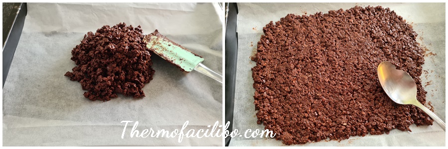 - Incorporar les neules a trossos petits i barrejar 30 segons, gir invers i velocitat 3. Abocar en la safata preparada i estendre la mescla per tota la superfície. Amb el dors d’una cullera, pressionar lleugerament fins que quedi uniforme. Reservar a la nevera. Rentar i eixugar el got.