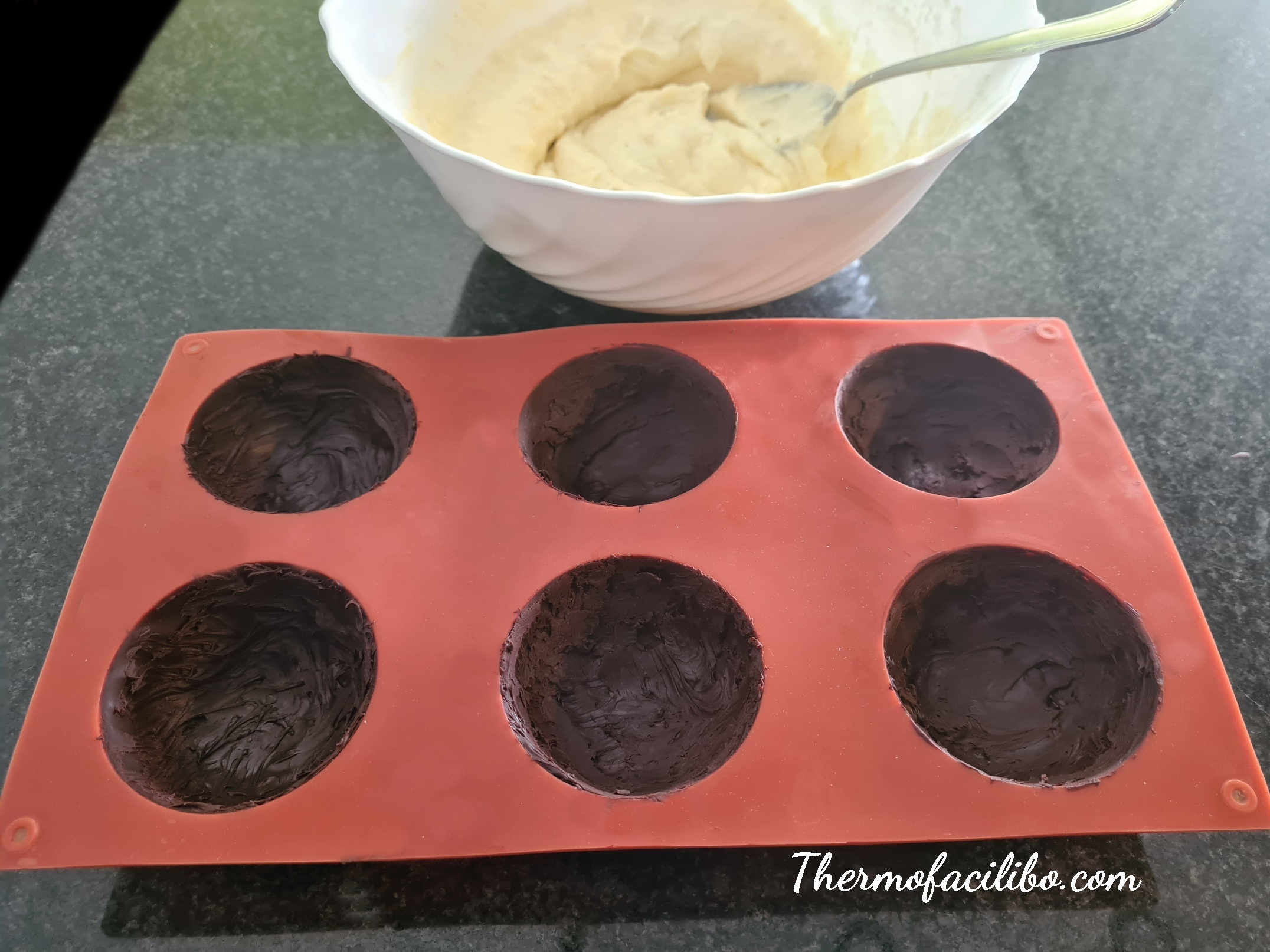 - Afegir la mantega i fondre 5 minuts, temperatura 65º, velocitat 1. Abocar en un bol i amb un pinzell, pintar l’interior de 6 motlles de mitja esfera (de 7 cm. de diàmetre) amb la xocolata (reservar-ne una mica per fer una segona pinzellada) Reservar a la nevera durant 10 minuts aprox. fins que endureixi. Tornar a pinzellar l’interior dels motlles amb la xocolata restant per així crear una capa més gruixuda. Reservar a la nevera.
