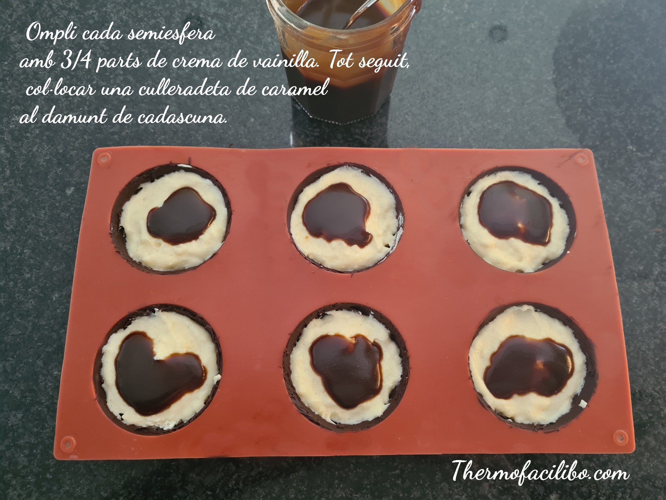 - Col·locar la papallona a les ganivetes. Posar dins el got la nata freda i, programar sense temps, a velocitat 3 fins que la nata sigui muntada però cremosa. Retirar a un gran. Afegir al bol la crema de vainilla freda a cullerades i, amb moviments envoltants, barrejar amb l’espàtula. Repartir la crema en el motlle de silicona omplint 3/4 parts de cada semiesfera i a continuació, afegir una cullerada de caramel al damunt de cadascuna.