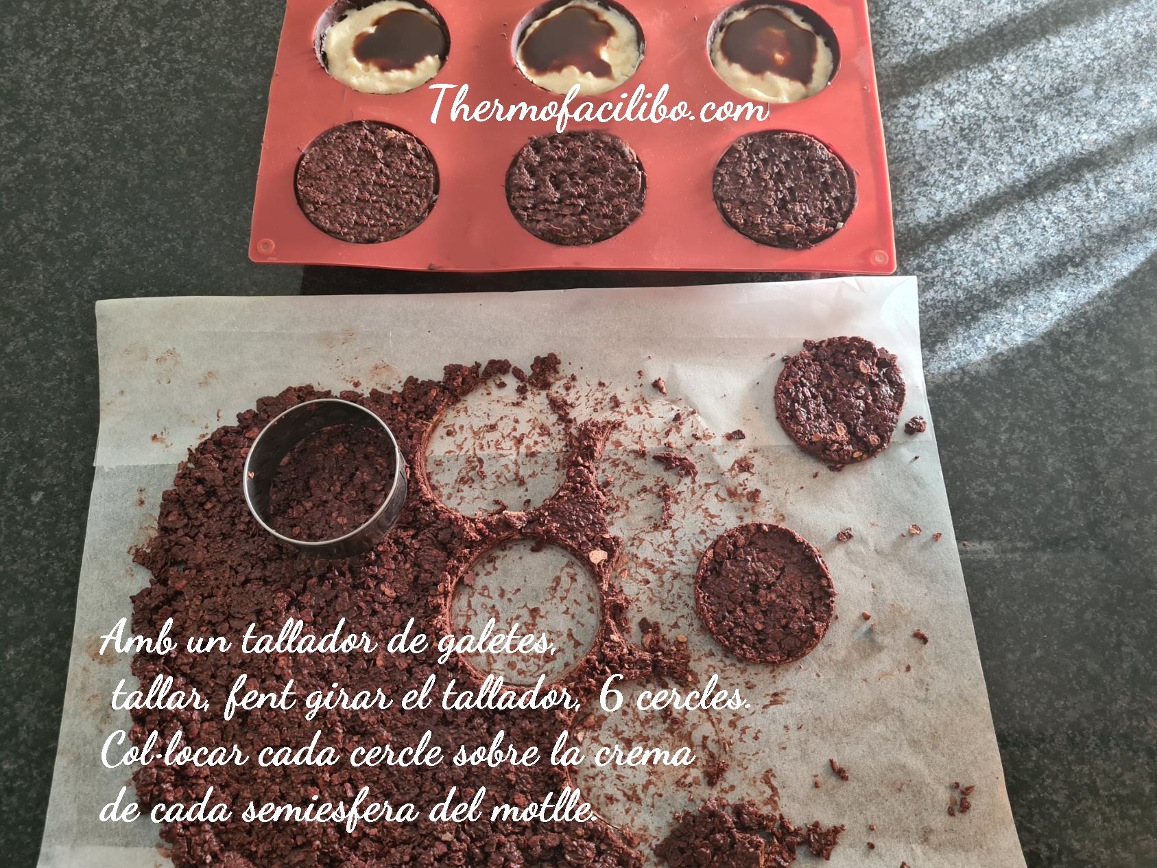 - Retirar la base de galetes de la nevera i, amb un tallador de pastes (de 7 cm de diàmetre), tallar, fent girar el tallador, 6 cercles. Col·locar cada cercle sobre la crema de cada semiesfera del motlle. Reservar al congelador durant aprox. 1 hora. O fins el moment de consumir.