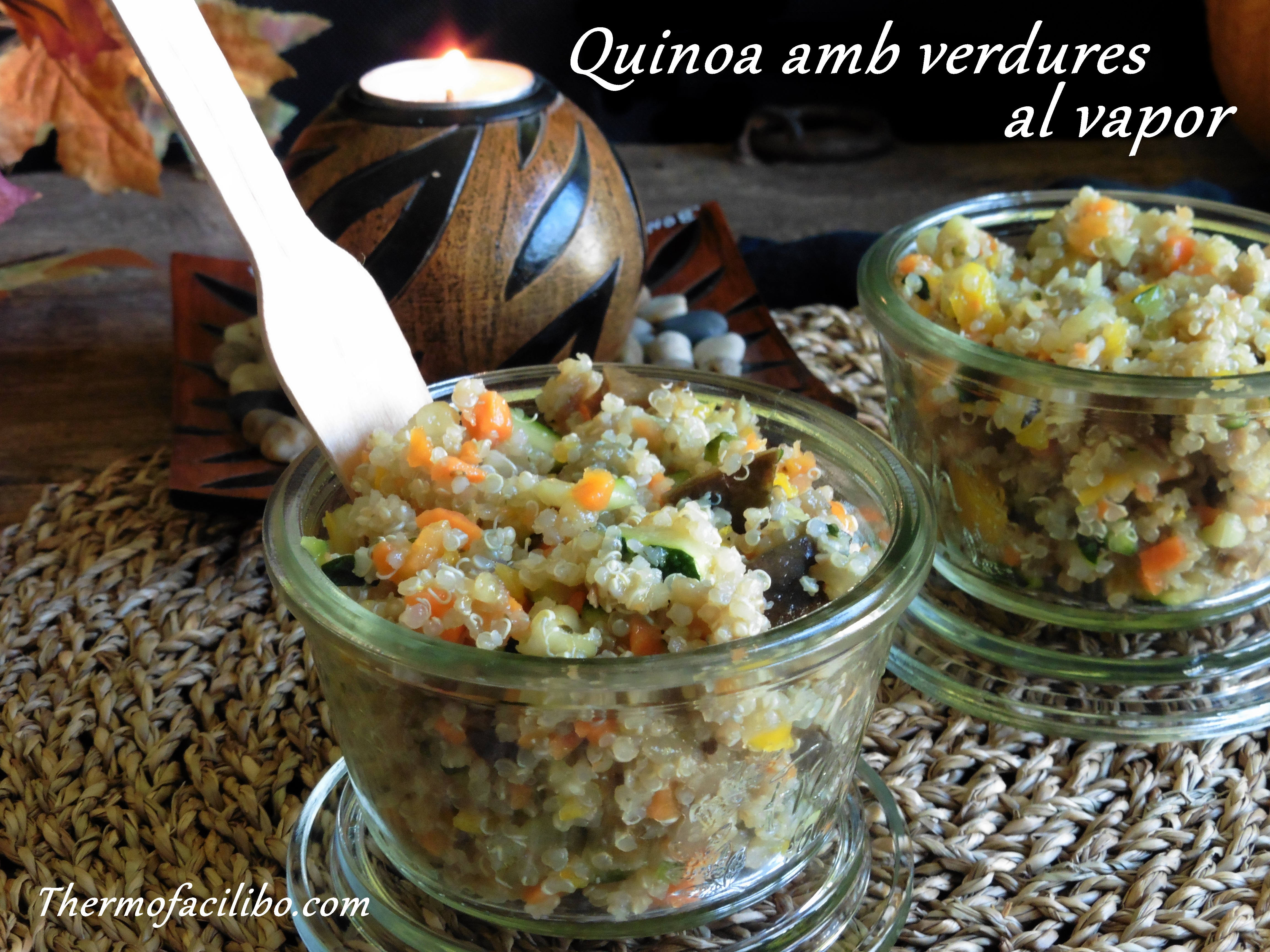 Us explico; Es col·loquen les verdures trossejades dins el recipient varoma, per coure-les al vapor mentre es fa la quinoa dins el got. Facil, oi??
