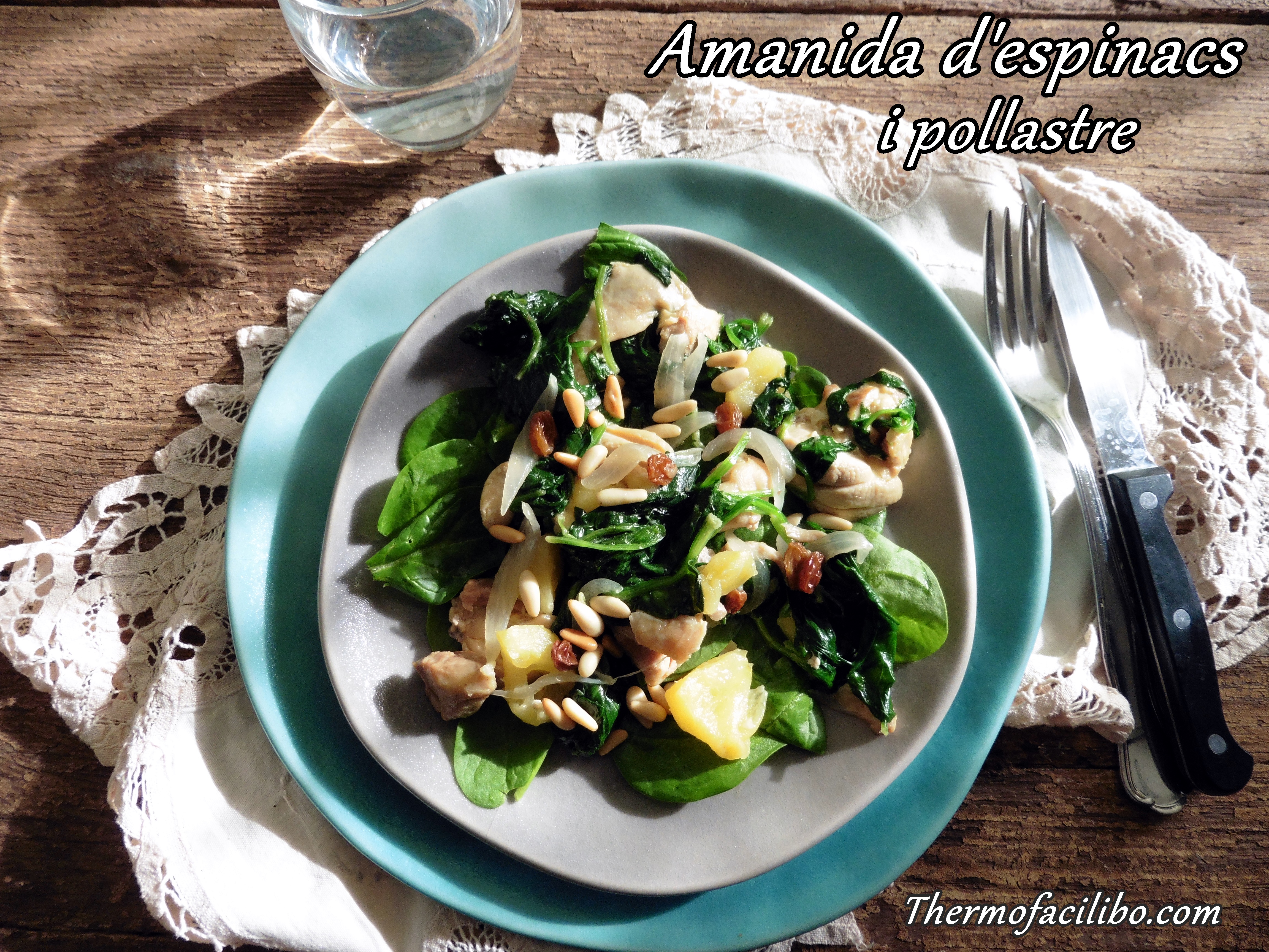Avui he fet aquesta amb espinac fresc, panses, pinyons, poma i pollastre. Una amanida tèbia boníssima, a més de completa i molt lleugera. Què us sembla??? A nosaltres ens encanta!!! Espero que a vosaltres també!!