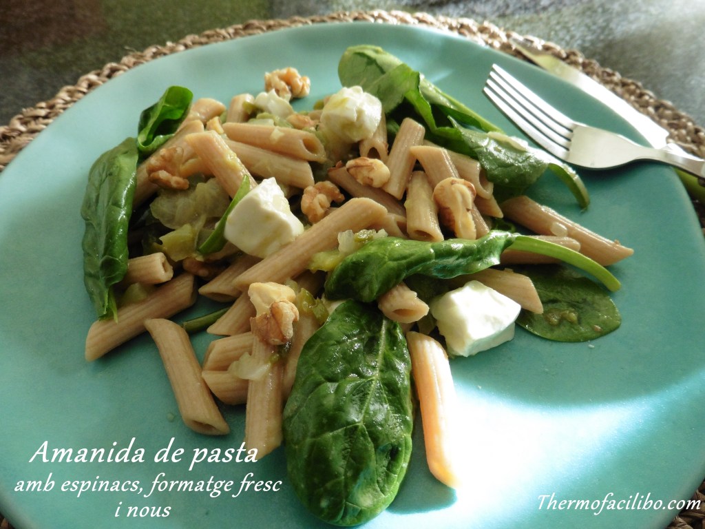 Amanida de macarrons integrals amb espinacs, formatge fresc i nous