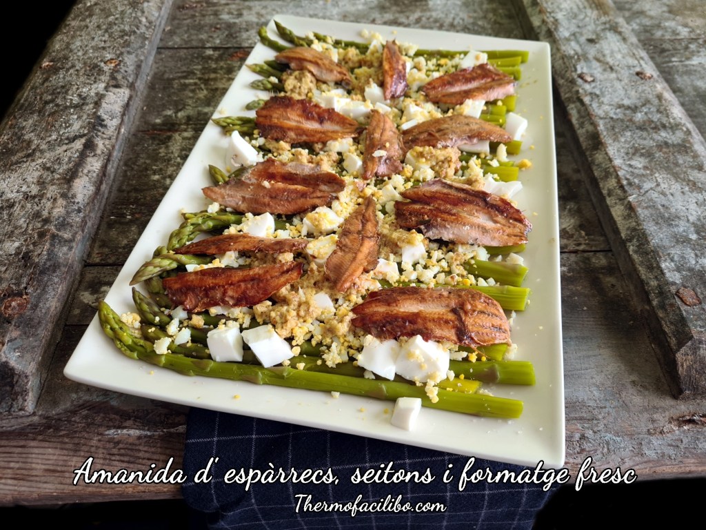 Ja sabeu que m’agrada moolt cuinar producte de temporada, així que aquests dies els espàrrecs tenen preferència, ara estan en el seu millor moment. Avui per sopar els he servit en «format» amanida, acompanyats de seitons i formatge fresc. Un plat lleuger i molt complet, que espero que us agradi.