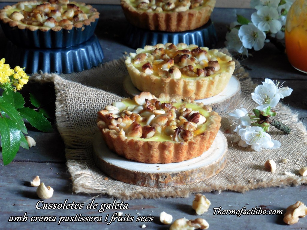 Aquestes cassoletes de galeta amb gust d’ametlla i taronja farcides de crema pastissera i amb el toc cruixent dels fruits secs, són un èxit a casa, sempre que les preparo desapareixen en un tres i no res.