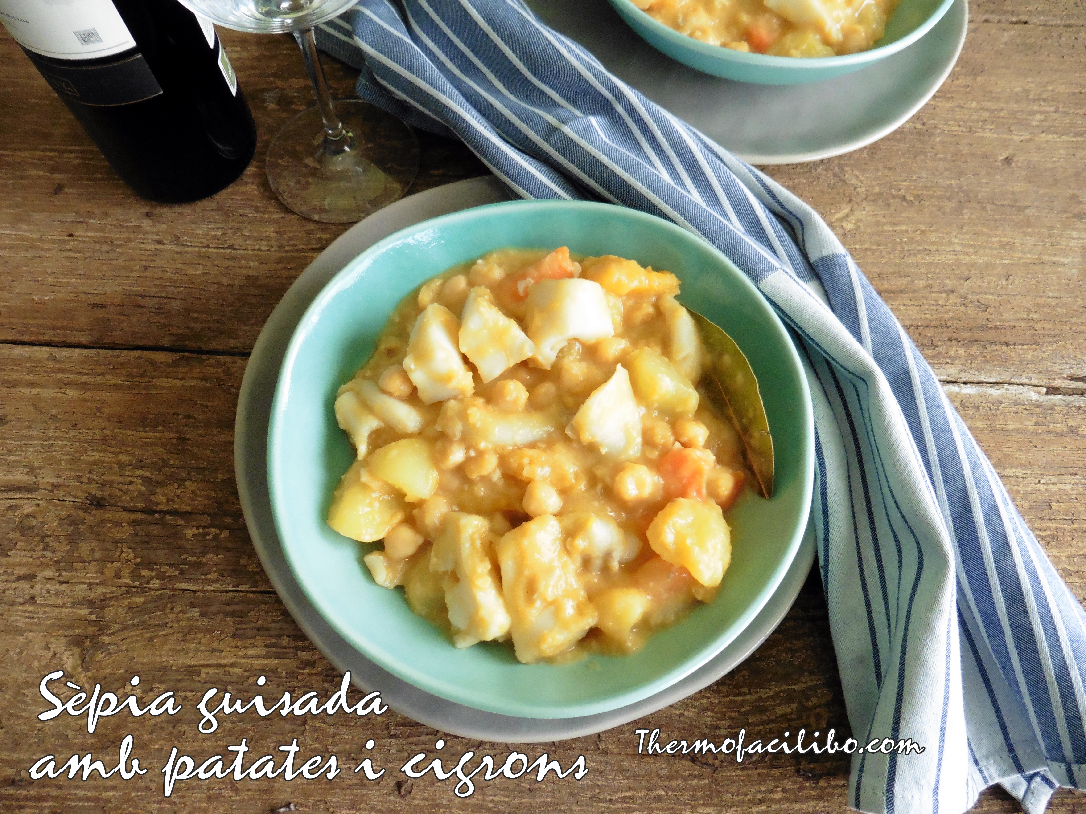 Sèpia guisada amb patates i cigronsNormalment, un parell de cops per setmana mengem llegums. M’agrada anar-les variant i preparar-les de diferents maneres. Quant fa fred acostumo a preparar-les estofades i servir-les ben calentes. Moltes vegades les combino amb verdures, carn o peix, com en la recepta d’avui. Són un dinar complet i nutritiu, perfecte com a plat unic.