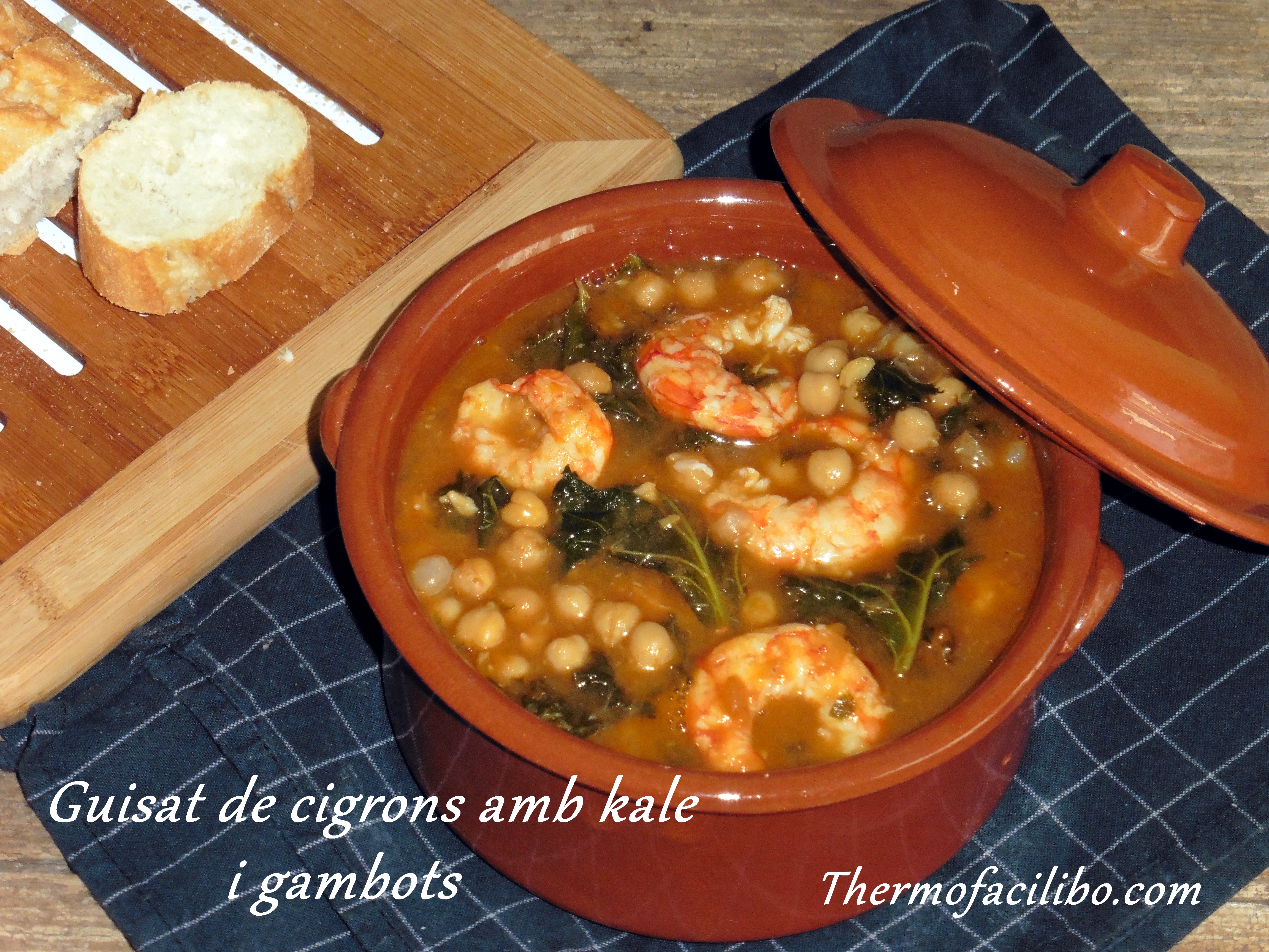 A l’hivern què millor que un plat com el d’avui per reconfortar el cos i fer pujar la temperatura corporal. Els llegums guisats, tipus «potaje», són un gran aliat quan les temperatures baixen, refan cos i anima. Ara bé!! Com que són plats calòrics i contundents sempre està bé alleugerir-los amb verdures de temporada, ja que hi combinen a la perfecció. El guisat d’avui està fet amb cigrons, col Kale i gambots, un plat súpeeer complet… I boníssim!!!