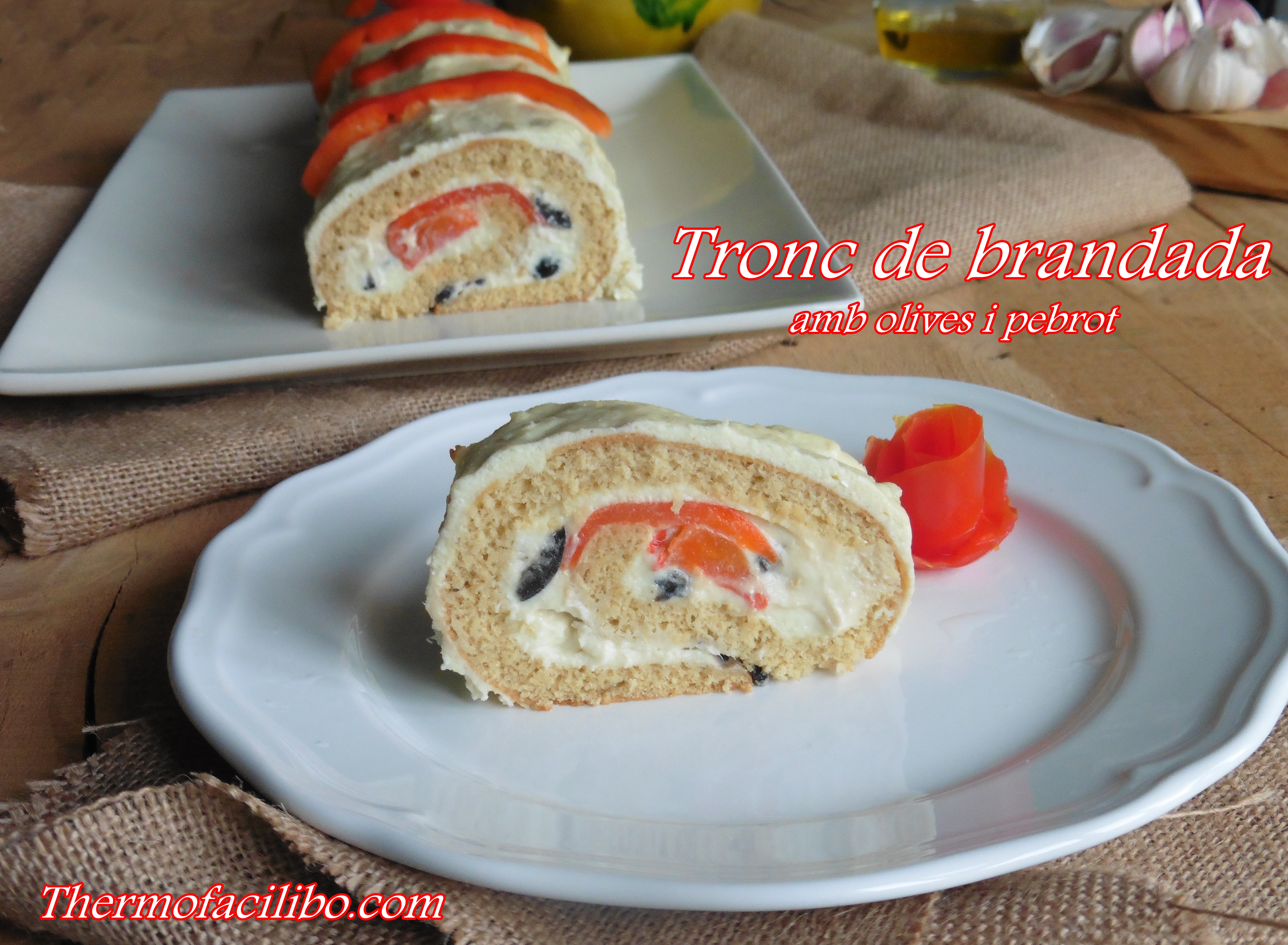 La recepta d’avui és un tronc o braç de gitano recobert amb brandada de bacallà i farcit també de brandada, pebrots del «piquillo» i olives negres. Jo l’acostumo a preparar al vespre per menjar-lo l’endemà al migdia, perquè tot i que es pot menjar tebi a nosaltres com més ens agrada és fred. Són tan còmodes les receptes que es poden deixar preparades amb antelació!