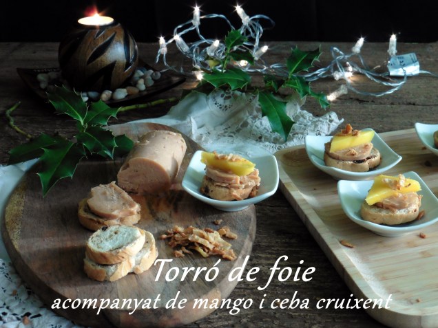Avui us en porto un de boníssim, a més de fàcil i molt «resulton», ideal per aquests dies de nadal. Un torró de foie, servit sobre torradetes i acompanyat amb mango i ceba cruixent. El podeu deixar preparat aquest cap de setmana, fer-lo, són encara no 5 minuts, i després el deixeu reservat en el congelador. Així ens traiem feina de sobre !!! 😉 En el moment de servir, només cal treure’l del congelador, tallar-lo (el podeu deixar un moment a la nevera, però es talla bé encara que sigui congelat) col·locar-lo sobre les torrades i acompanyar amb el mango i la ceba cruixent.