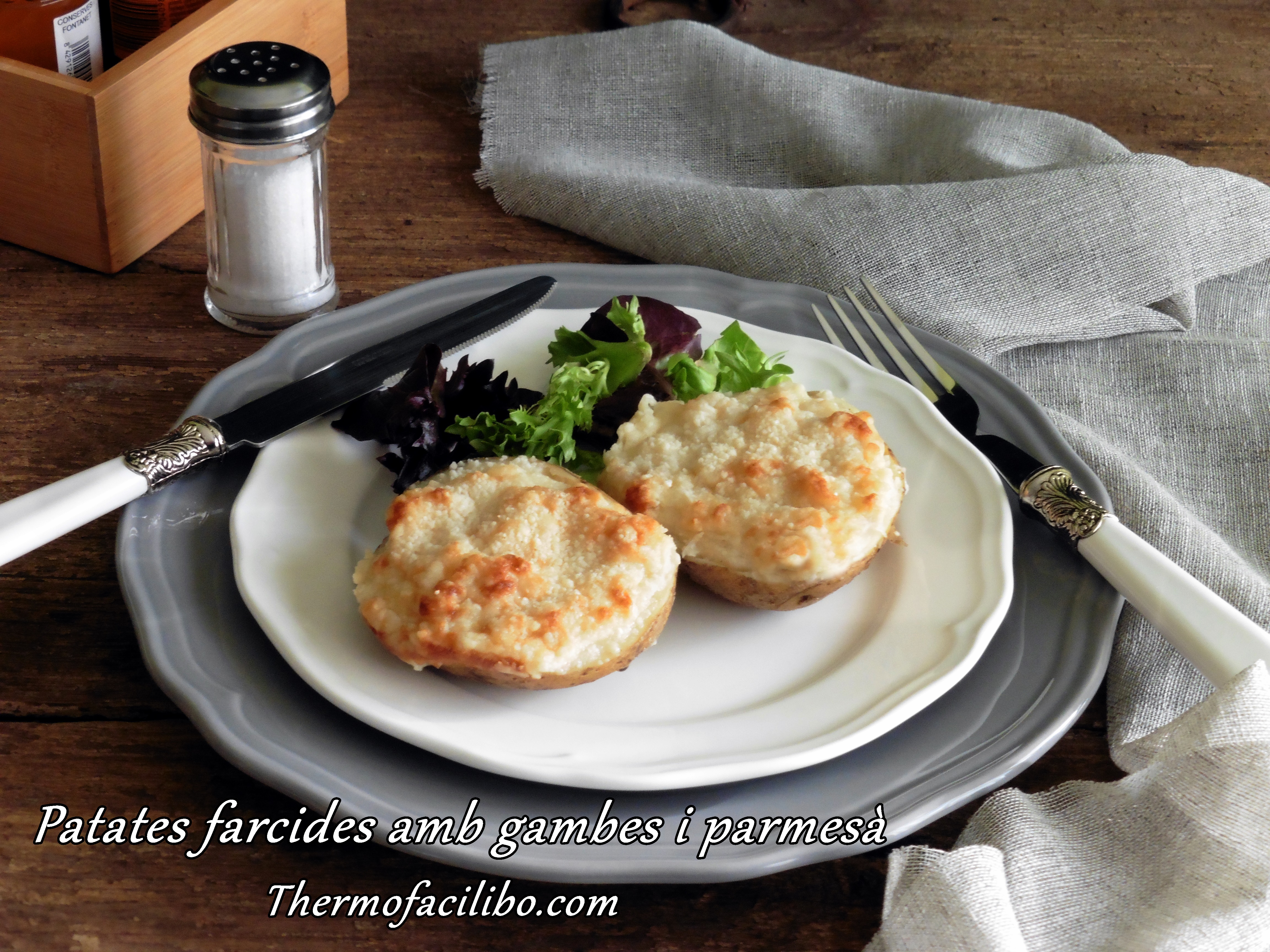En aquesta ocasió les he fet farcides de gambes i parmesà, una recepta que a casa té molt bona acceptació i que repeteixo de tant en tant. No són gens complicades de fer i queden boníssimes!!! A més, tenen l’avantatge que es poden preparar amb antelació i deixar-les a punt per gratinar en l’últim moment.