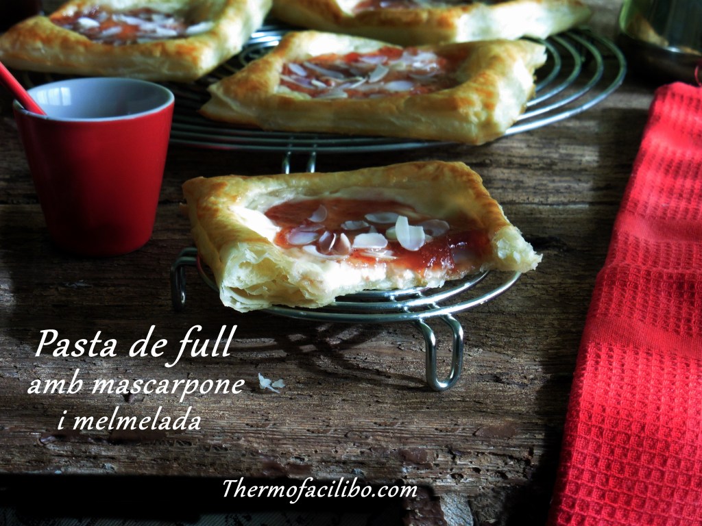 Només cal una làmina de pasta de full, una mica de mascarpone endolcit amb mel. Una cullerada de melmelada, un ou batut per pinzellar i opcionalment, unes quantes ametlles laminades per decorar. Enfornar 15 minuts…. I llestos!!!