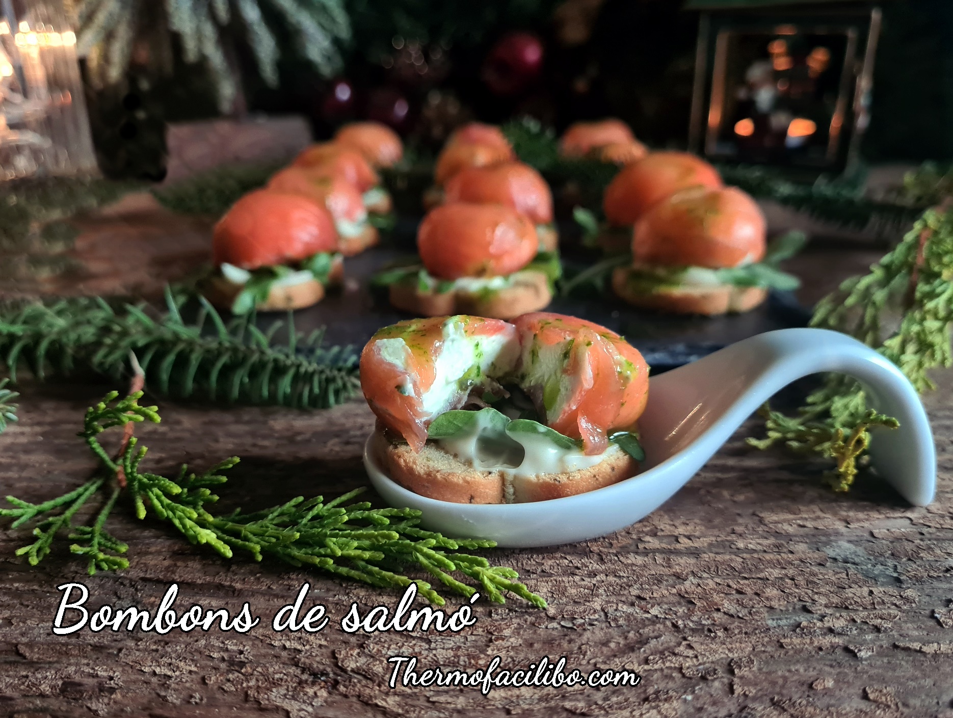 A mi m’agrada molt, per a les nits de Nadal i la de fi d’any, preparar diferents aperitius en forma de petits mossets, per anar picant. Un dels pica-pica que faré seran aquests bombons de salmó presentats sobre torradetes untades amb maionesa i fulles de ruca. Els bombons porten un farcit molt suau de crema de formatge i maionesa i van regats amb un oli de julivert. Són ràpids de fer, surten boníssims i tenen una presentació exquisida!!! A més, es poden preparar amb antelació, només cal tenir en compte de fer el muntatge en l’últim moment, perquè la torradeta no s’estovi.