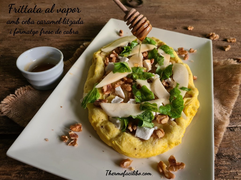 Avui per sopar frittata al vapor amb ceba caramel·litzada, formatge fresc de cabra, anous i pera. Us animo que la tasteu, és una manera diferent de menjar truita. Jo l’he acompanyat amb una amanida mixta i «voilà», un sopar sa, lleuger, fàcil i boníssim!!!