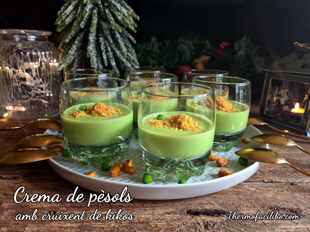 Una altra opció per portar a taula en format «tapeta» les nits nadalenques són les cremes de verdures. Jo aquest any faré la crema de pèsols amb cruixent de kikos, el contrast dolç de la crema amb el salat dels kikos sol agradar molt. La crema es prepara en 20 minuts i es pot tenir feta amb antelació. En el moment de servir-la, li afegim el cruixent de kikos i una altra tapeta llesta.